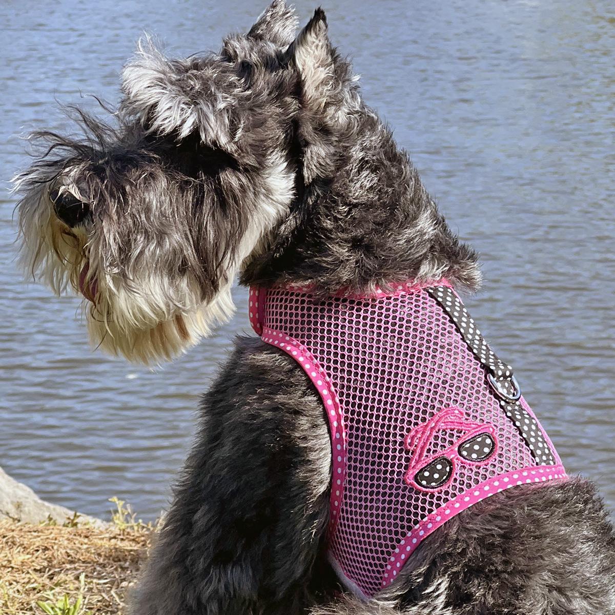 Make a splash of fun and keep your dog cool in the dog days of summer with the cute Cool Mesh Dog Harness Under the Sea Collection Pink and Black Polka Dot Sunglasses! Part of Doggie Design's Under the Sea Collection, this adorable Cool Mesh Dog Harness is trimmed in a cheery polka-dotted black and pink with an adorable, embroidered sunglasses accent. This netted dog harnesses will help your pup beat the heat with this breathable breezy style.